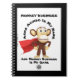 Notebook espiral preto e branco com "MONKEY BUSINESS ARMS AKIMBO É O MEU NOME E O MACACACO É O MEU JOGO" e com uma fotografia do Arms Akimbo. Braços Akimbo é um super-herói da floresta tropical. Ele tem uma história de fundo muito interessante. Talvez eu te conte às vezes.