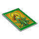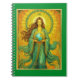 Notebook em uma interpretação Art Nouveau do cartão de tarô mundial mostrando uma mulher em vestes azuis fluindo segurando um globo, cercada por padrões radiantes. Ela representa a sabedoria que sustenta a vida neste e em todos os mundos, e nos convida a uma cidadania cósmica