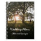 Os planos wedding personalizados bonitos registram o design que caracteriza árvores no crepúsculo, mostrado em silhueta com o brilho do sol completo os ramos de árvore enquanto vai para baixo. A luz do sol está jogando nas flores selvagens sob as árvores.
