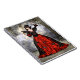 Renderização digital em 3D de um belo feiticeiro feminino em um vestido vermelho e preto com asas em um fundo de castelo fantasticamente assustador