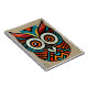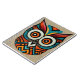 Esta é uma coruja decorativa feita à mão e estilizada com padrões astecas em cores preta, vermelha, turquesa e laranja.