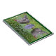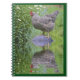 Este caderno apresenta uma galinha de rocha barrada sobre flores e reflexões de um meio-jardim de cogumelos de madeira.