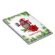 Urso de pelúcia de Natal com um presente e um quadro de ramos de abeto e uma grande poinsettia vermelha