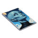 Notebook Ufology. Uma bela alienígena extraterrestre fêmea com grandes olhos azuis olhando para o espaço nas estrelas e nos planetas.