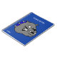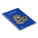Uma cabeça de desenho animado de um cão-mouro de cinza decora a frente deste caderno espiral azul, com texto personalizado branco pronto para personalizar. Excelente para escola, casa ou escritório.