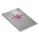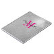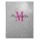 Bloco de anotações espiral de monograma com brilho prateado. Escritório monograma e material escolar com textura falsa de prata. Adicione sua própria letra inicial de nome de classe. Escrita elegante. Design metálico chic para notas escrevendo, trabalho de escritório, planejamento de casamento e muito mais. Logotipo preto e cor-de-rosa neon com brilhos cintilantes e brilhos brilhantes.