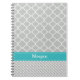 Este notebook bonito e na moda tem uma cinza de luz fofinha e um design de quatrefoil azul aqua e padrão de bolinhas. Personalize este moderno caderno espiral com qualquer nome.