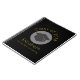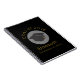 Um caderno espiral que diz Classe 20xx e nome do formando e escola, escrito em cor dourada. Projetado com um boné de formatura preto cercado por um círculo branco semitransparente. O fundo preto com letras douradas é simples, mas na moda.
