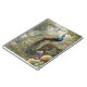 pintura botânica vintage de pavão sobre escadas em um jardim inglês cercado por flores pastel