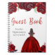 This Quinceanera guest book features faux glitter red floral flowers and a beautiful princess with brown hair and an elegant dress. This is perfect for a Quinceanera birthday party.