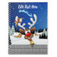 A Funny cartoon reindeer with a bright red nose and large white antlers, adorned with a red and gold bow, peeks through an open window. Outside, a snowy landscape with silhouetted pine trees and a small, glowing house is visible under a dark blue, star-filled night sky. Santa's sleigh pulled by reindeer is flying in the distance. The scene evokes a festive and whimsical Christmas atmosphere. Original Vector Art Copyright BluedarkArt TheChameleonArt.