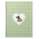 Um padrão bonito no estilo country com uma foto de um cão marrom colorido no meio de um coração branco colado sobre um fundo verde sage gingham.