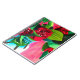Arte de aquarela original das flores florais da Camélia Vermelha com folhagem verde contra um fundo cor-de-rosa vibrante e amarelo. Pelo artista Sacha Grossel, este design de flor botânica é espantoso.