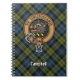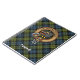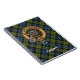 Crachá da crista Campbell rodeado por uma correia e fivela sobre fundo tartano. Texto personalizado.