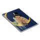 Ilustração antiga de amor e romance com imagem de casamento apresentando um casal de bebês fofos sentados em uma lua crescente no céu noturno com estrelas cintilantes. A noiva tem um véu transparente e um buquê de flores de casamento e o noivo tem um chapéu alto.