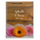 O encantador Notebook Espiral Rustic Daisy Trio Country Wedding pode ser personalizado com os nomes da noiva e noiva e a data da cerimônia de casamento do celeiro para criar um livro de hóspedes, um livro de aconselhamento ou um lugar personalizado para manter o seu planejamento de casamento para fazer lista. Apresenta uma fotografia floral tênue de duas margaridas cor-de-rosa e uma flor de margarida cor de laranja e um véu branco com um fundo de madeira de celeiro curgado castanho. Inspo perfeito para um evento casual de celebração de estilo de fazenda ou rancho.