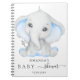 Um livro de hóspedes de chá de fraldas celebrando um menino. Um fundo branco na moda com um lindo garoto elefante em azul. Adicionar um nome e uma data.