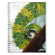 Fotografia de um camaleão verde comum num galho cortado na cauda enrolada.