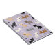 Cães chihuahua bonitos em preto, marrom, bronzeado, creme, cinza e casacos azuis sentam-se e ficam espalhados por ossos de cachorro e estampas de pata em um fundo roxo claro.