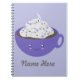 Projete a caracterização da imagem do vetor de um bonito, sorrindo, caneca roxa de chocolate quente com chantiliy e o coração dado forma polvilha.