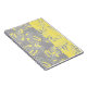 Caderno Espiral Cinzas e folhas amarelas sobre fundo listrado.