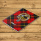 Crachá da crista Clan Wallace rodeado por uma correia e fivela sobre fundo tartano. Texto personalizado.