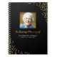 Elegante livro de condolências em bloco de notas com uma foto do seu ente querido, um fundo preto que pode ser mudado para qualquer cor, brilho dourado brilhante, e um modelo de texto personalizado com seu nome e datas.
