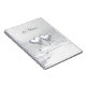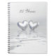 Notebook com meu trabalho de arte prateado de 2 corações prateados flutuando na água. O texto personalizável diz "25 anos".