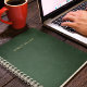 Um caderno elegante com uma textura de couro verde escuro e destaques em letra dourada. Este design sofisticado e elegante oferece uma sensação premium, tornando-o perfeito para anotar notas, ideias ou pensamentos importantes de forma refinada e luxuosa.