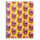 Um caderno de padrões do crânio bonito com uma ilustração cartoon de um crânio rosa engraçado com ossos rosados e dois fantasmas bonitos nos seus olhos olhando uns aos outros e sorrindo, uma pequena aranha adorável em cima de um desses amigos assustadores. Esta design macabra divertida tem cores psíquicas brilhantes, cor-de-rosa-triquete e amarela.