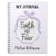 Cruz floral com caderno de citação cristão/diário. "Fé sobre o Medo". Cruzamento floral de lilás pastel pálido. Design.