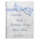 Mulheres Ninetieth elegantes do livro de hóspedes da festa de aniversário. festa de aniversário do 90! Fundo branco bonito da cor damasco com um arco e uma imagem azuis românticos bonito, à moda da fita. Estes livros de hóspedes glamoroso, elegantes são perfeitos para mulheres e são decorados/imprimidos na parte anterior somente. As mulheres amarão este livro de hóspedes moderno chique da festa de aniversário. Todo o texto é inteiramente customizável cumprir suas exigências. NOTE POR FAVOR: Todos os produtos em Zazzle têm imagens impressas do plano. Imagens do arco e da fita compradas de digital-design-por-Elena. Se você precisa algum auxílio que personaliza seu produto me contacta por favor através de minha loja e eu estarei feliz ajudar.