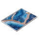 Elegante design abstrato azul semelhante a geodo com detalhes dinâmicos em ouro rosa, apresentando um espaço circular central em branco ideal para personalização. Perfeito para fundos, convites ou projetos visuais criativos.