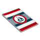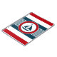 Design náutica com decoração em forma redonda de embarcações à vela, em fundo listrado, a azul, vermelho e branco