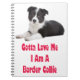 Regra de Collies de Fronteira! Este notebook bonito apresenta um cachorro preto e branco "Border Collie Puppy" realçado sobre um fundo branco cremoso. As palavras "Tenho que me amar, sou uma collie de fronteira" são impressas em uma fonte vermelha e bonita.