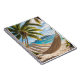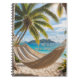Notebook com praia tropical com palmeiras e rede. Excelente para notas de viagem.
