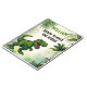 Uma selva, floresta tropical como fundo. Uma imagem de um Tiranossauro Rex com a citação: Pronto para governar a escola. Texto verde.