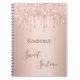 Um caderno para um aniversário brilhante e glamouroso de 16 anos. Um fundo rosa de ouro falso com um brilho elegante rosa de ouro brilhante, pintura pingada. O texto: Doce Dezesseis é escrito em ouro rosa escuro com um grande estilo escrito à mão moderno. Tempate por um nome. Perfeito como um guia de festa de aniversário ou para planejamento e organização de partidos.