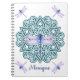 Bonito caderno de libélula mandala personalizado. Possui uma magnífica mandala azul com quatro libélulas roxas e azuis de cor d'água nos quatro cantos e uma libélula maior no centro superior da mandala. Fundo branco. Personalizado com seu nome em uma fonte de script fofa.