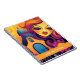 Vibrantes espirais de laranja e amarelo criam um pano de fundo caprichoso para uma figura feminina estilizada com cabelos roxos fluidos e olhos fechados. Uma casa branca, azul e laranja, com um teto em forma de cúpula, encontra espaço nas curvas de seu cabelo, acrescentando à cena um sonho de qualidade.
