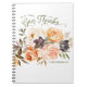 Este jornal tem um buquê floral bonito e apresenta um verso Bíblia. As cores utilizadas incluem o verde-oliva, o pêssego, a ameixa, o verniz e a laranja. No topo está um texto estilizado em verde que diz "Em todas as coisas dão Obrigados". Tudo é mostrado em um fundo branco. O dentro contém 80 páginas com linha. Coordena-se com a coleção de Rosas de Pêssego do Chique.