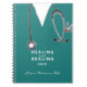Design de notebook bonito para enfermeiras com citação engraçada, esfregões hospitalares, estetoscópio e faca do Exército suíço. Editar texto para adicionar o nome do formando da escola de enfermagem e o ano.