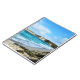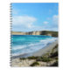 Imagem é uma vista maravilhosa de uma praia com areia branca, águas do mar azul aqua e penhascos de ascensão