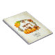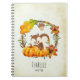 Notebook espiral com um esquilo giro parado atrás de algumas abóboras cor de água laranja. Uma coroa foliar rodeia-os com uma folha de carvalho e flores laranja e outros ramos e folhas. O fundo é uma cor creme, com um olhar áspero envelhecido à volta das bordas.