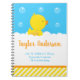 Este notebook bonito e divertido apresenta um adorável pato amarelo em bolhas brancas de banho de sabão sobre um fundo azul brilhante com fita laranja e listras amarelas. O texto combina o script manuscrito e as fontes sans serif para uma aparência na moda e moderna. Ele pode ser personalizado com as estatísticas de nascimento do seu bebê, como nome, tamanho, data e hora de nascimento, ou se você quiser dar a ele como um presente de chá, você pode editar e remover texto.