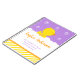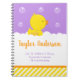 Este notebook bonito e divertido apresenta um adorável pato amarelo em bolhas brancas de banho de sabão sobre um fundo roxo brilhante com fita laranja e listras amarelas. O texto combina o script manuscrito e as fontes sans serif para uma aparência estilosa e moderna. Ele pode ser personalizado com as estatísticas de nascimento do seu bebê, como nome, tamanho, data e hora de nascimento, ou se você quiser dar a ele como um presente de chá, você pode editar e remover texto.