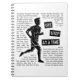 Um design de notebook preto e branco e escreva que usa os pensamentos do designer sobre como correr em direção ao ponto final é comparável a ir atrás das metas na vida. O texto significativo forma um pano de fundo para a impressionante silhueta preta de um ajustado e magra corredor macho em shorts. Excelente como design de motivação e encorajamento para alguém ter a tenacidade e a perseverança para dar um passo de cada vez em direção aos seus objetivos.
