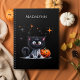 Bloco de anotações do Dia das Bruxas de Gatinhos Pretos Engraçados e Bonitos. Um truque ou trato divertido e assustador com um gatinho de olhos largos, fofo, mas assustador, vestindo uma fantasia fantasma pura! A expressão estranha do gatinho e roupa branca adiciona um toque de charme de Halloween. É fácil adicionar seu nome no espaço fornecido.