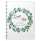 Uma cor branca de fundo. Adicionar um nome e uma data. Decorado com uma camada verde de eucalipto de cor aquosa. O texto: Guest Book é escrito com um moderno script de estilo escrito à mão.