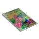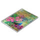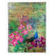 Esta bela design mostra um pavão maravilhoso e penas cercadas por flores roxas e rosa vibrantes, todas sobre músicas de folha, sobre um fundo verde, na sua maioria claro